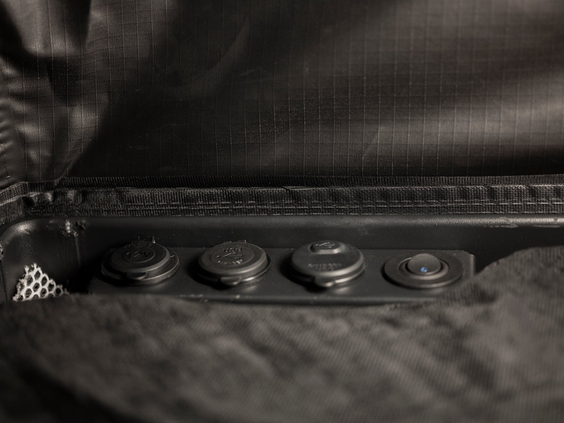 • Integrated 12 V power system: LED light, USB ports, cigarette socket, and Anderson plug